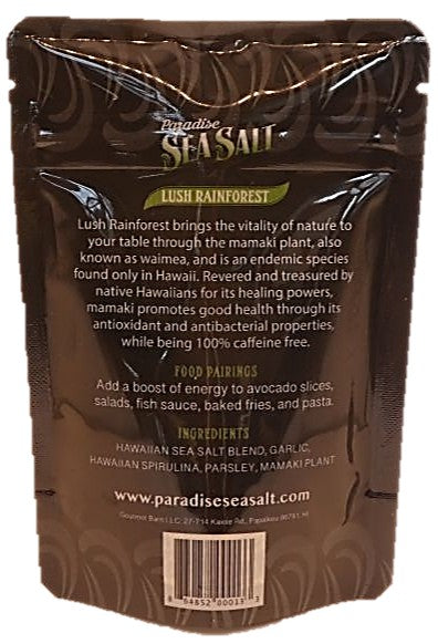 Ingredients: Hawaiian Sea Salt Blend, Pure Hawaiian Spirulina, Garlic, Parsley, Hawaiian Mamaki